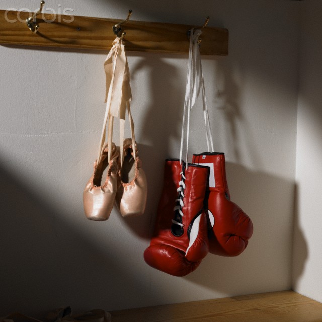 04 Jun 2010, New York, New York, USA — Boxing gloves and ballet shoes hanging in dressing room — Image by © Jack Miskell Photography/Corbis